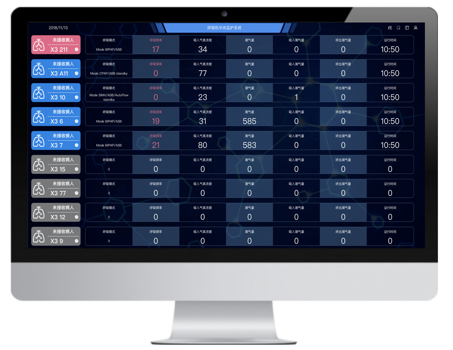 多臺不同品牌的有創(chuàng)呼吸機(jī)聯(lián)網(wǎng),并通過大屏實時集中呈現(xiàn)治療預(yù)設(shè)參數(shù)和監(jiān)測參數(shù),實現(xiàn)多臺集中監(jiān)測、集中管理和數(shù)據(jù)存儲。