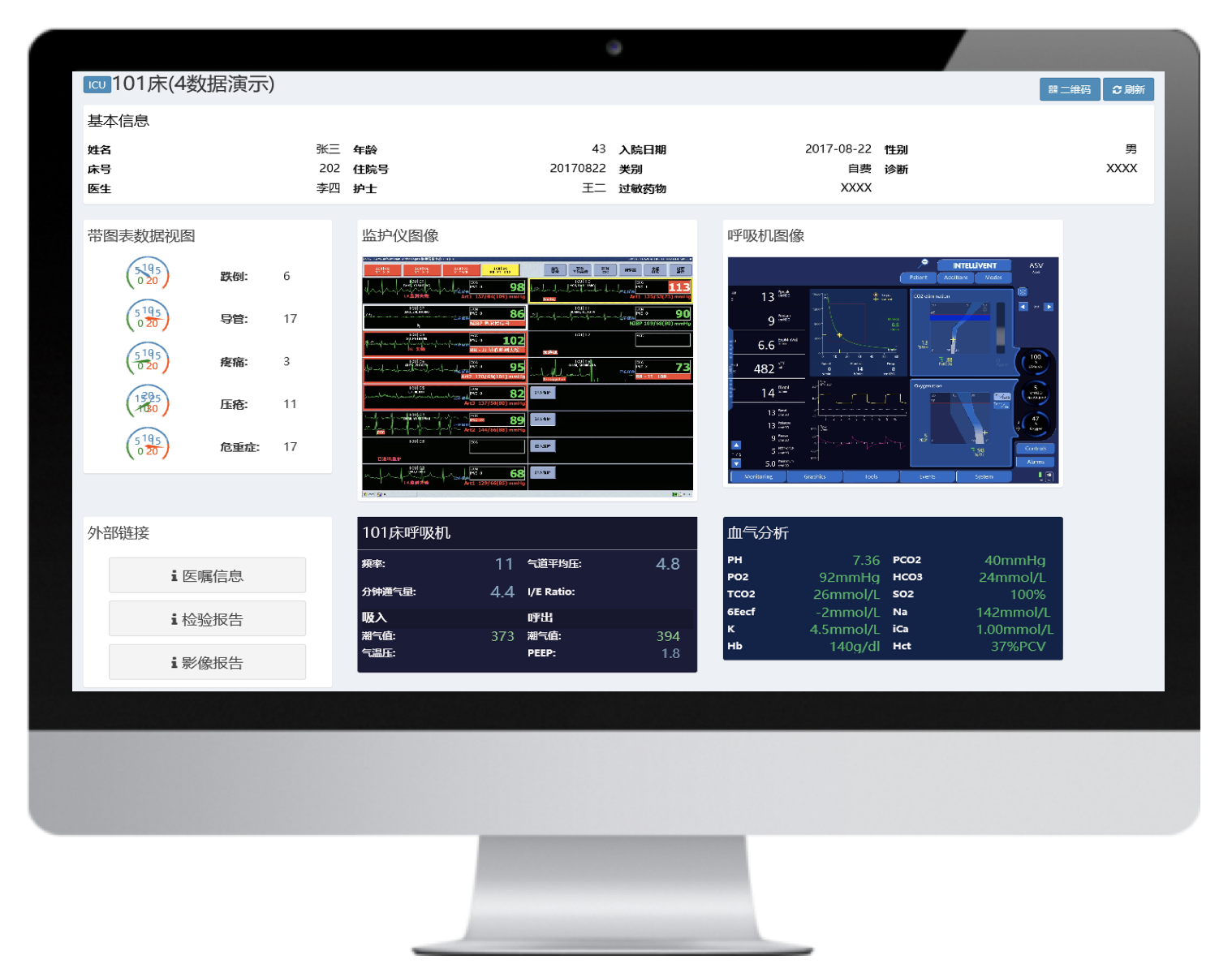 實時呈現(xiàn)病人體征參數(shù)、變化趨勢,診療設(shè)備參數(shù),同時接入醫(yī)囑、檢驗結(jié)果數(shù)據(jù),一體化呈現(xiàn)存儲和回溯,方便醫(yī)護(hù)急救、會診、查房